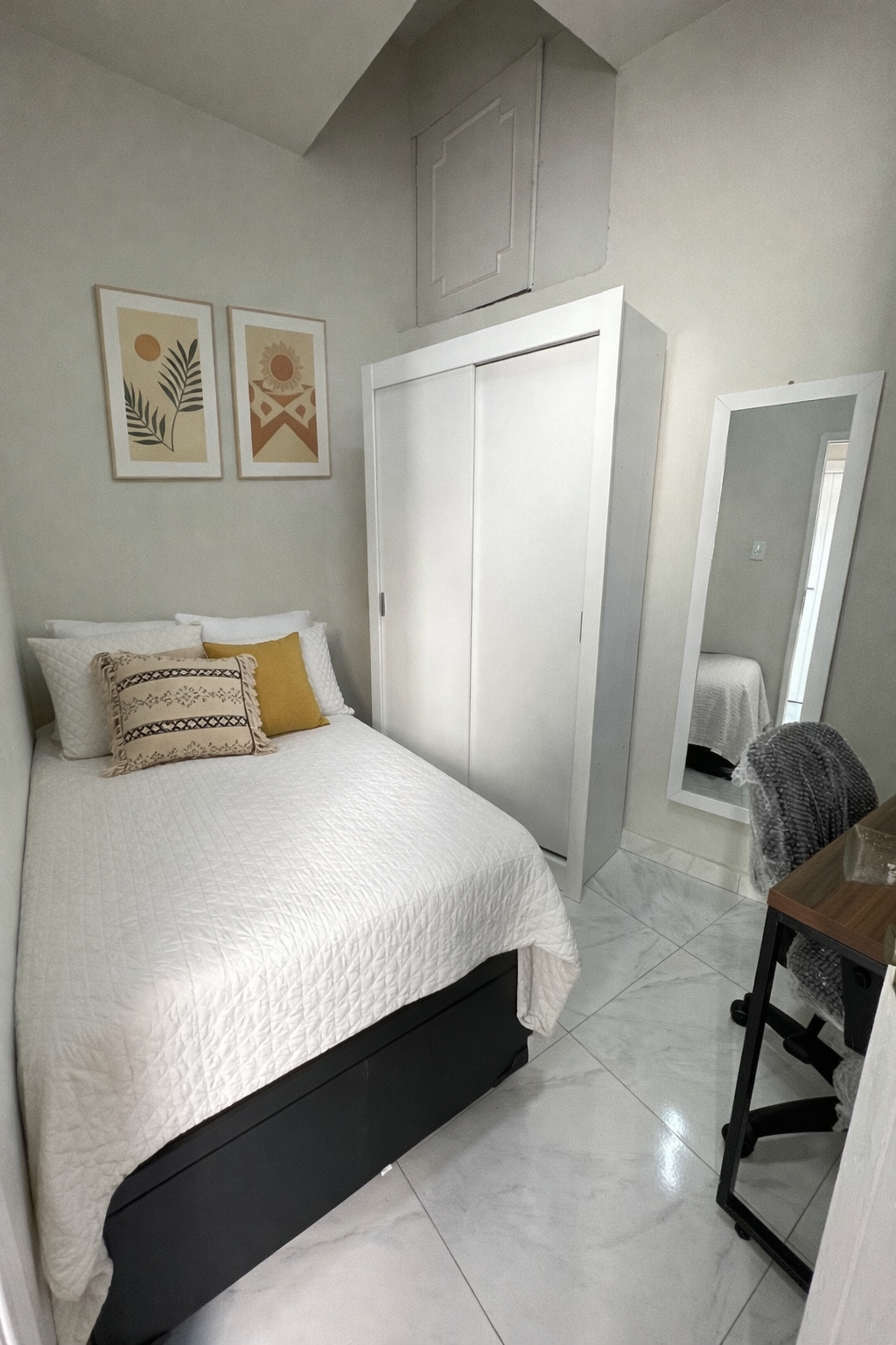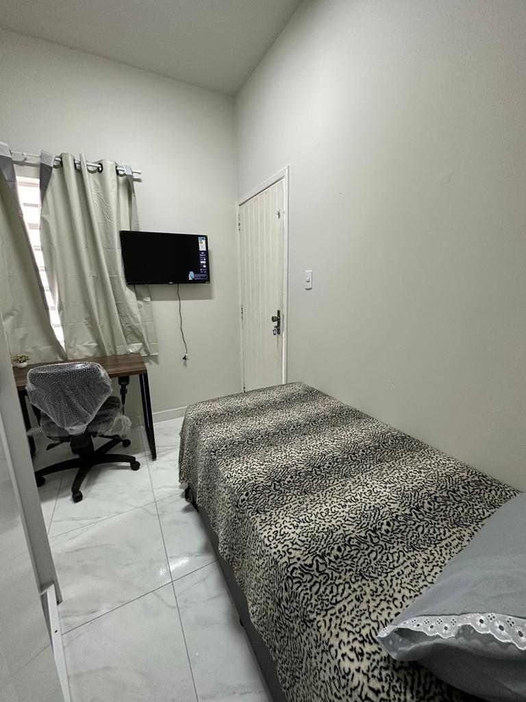 Mobiliado: cama de solteiro com box baú, armário, Smart TV, espelho, ventilador, mesa e cadeira.(roupa de cama não está incluso)
